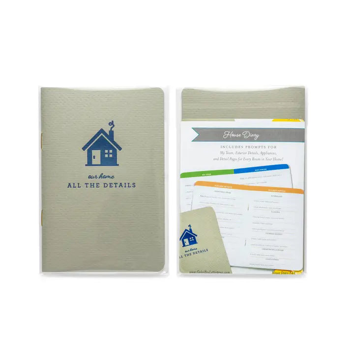 Keep track of all your home records in our handy House Diary! A journal to keep track of paint colors, fixture details, warranties, appliance model numbers, your home care team and more! It is the perfect size to throw in your bag on your way to pick out new furniture, look at new appliances, match paint colors, etc! Includes prompts for: My Team Exterior Details Appliances Detail Pages for Every Room in Your Home and more!