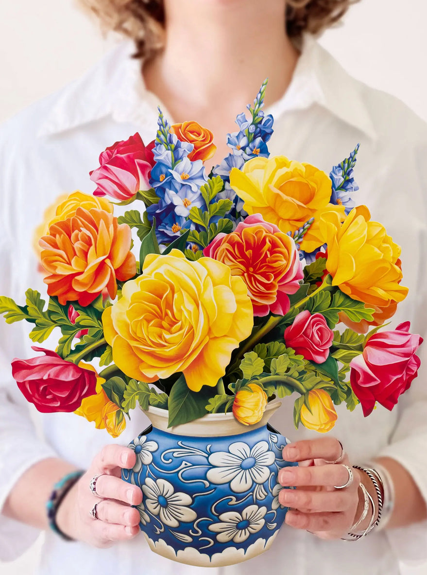 An exquisite arrangement of refreshing roses is a rare beauty to behold and the ultimate way to say “I’m thinking of you.” Elegantly gathered together with blue snapdragon accents, raspberry red, tangerine orange, strawberry pink, and limoncello yellow radiate out from standard and garden roses in a fitting blue and white floral vase. Symbolic of passion, courage, and love, FreshCut Paper’s Sorbet Roses are a fresh and sweet delight that brighten up every space they bloom in.