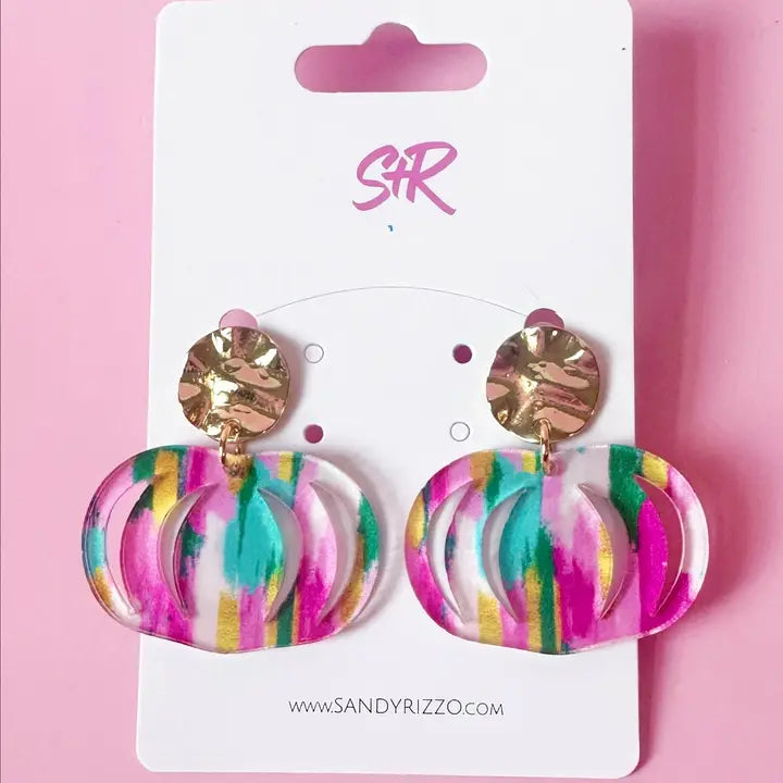 Add a pop of playful color to your Fall and Halloween looks! These multicolored acrylic pumpkin earrings feature a chic gold wavy top, blending festive fun with modern style.