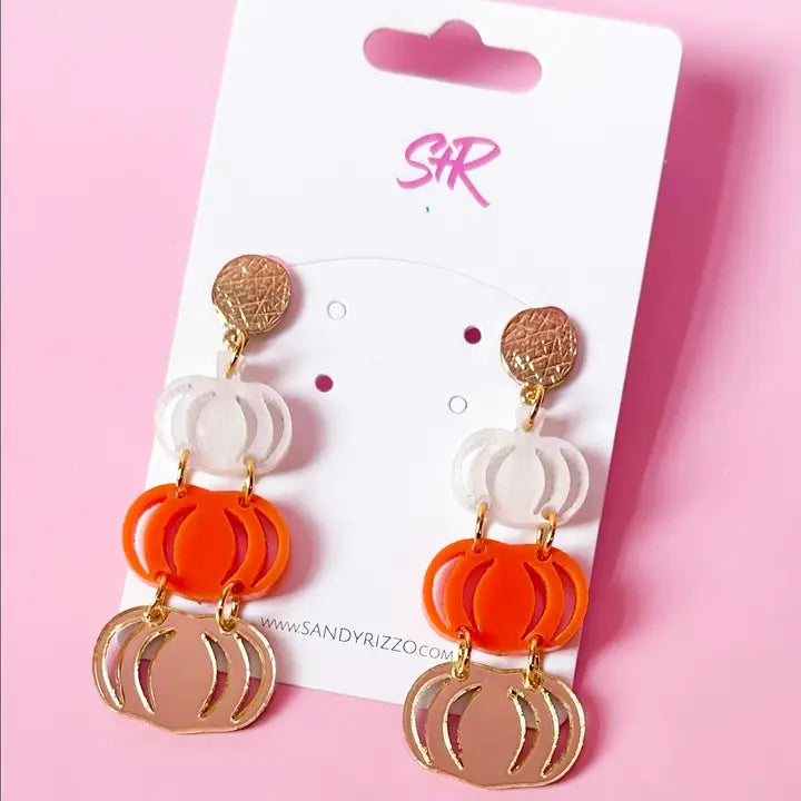 Fall just got a whole lot cuter! These bold and playful pumpkin dangles feature a stacked trio of pumpkins in eye-catching colors: 🍑 A matte pink mini pumpkin on top 🌈 A multicolored mid-size pumpkin in the middle 🧡 A shiny orange mirror pumpkin at the bottom 🍃 Finished with a green enamel top for that perfect pumpkin patch touch!
