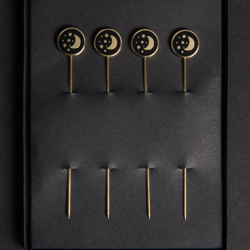 Starry swizzlers to fancify your drinks. A set of 4 gold and black enamel cocktail picks adorned with a moon and stars. Packaged in our custom printed box. Approximate dimensions: 4” long pick with 0.5 x .4” diameter top.
