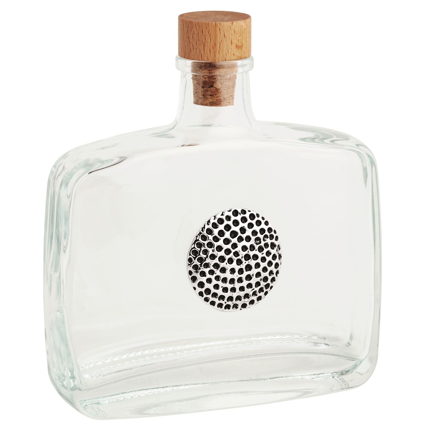 Glass decanter features cast aluminum icon exterior and cork stopper with wooden top.
