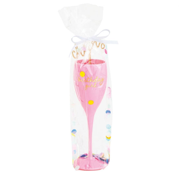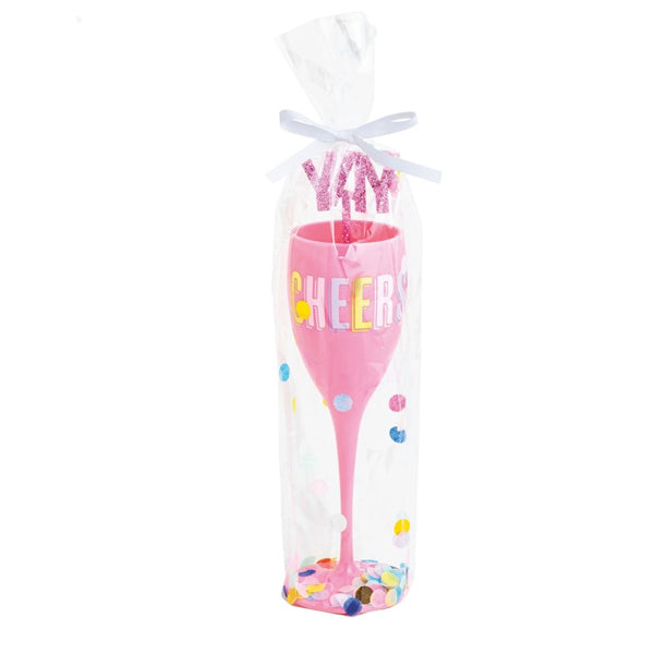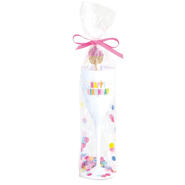 2-piece set. Acrylic champagne flute and drink stirrer. Set comes wrapped in cello with confetti.