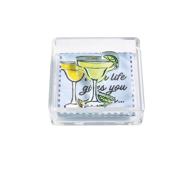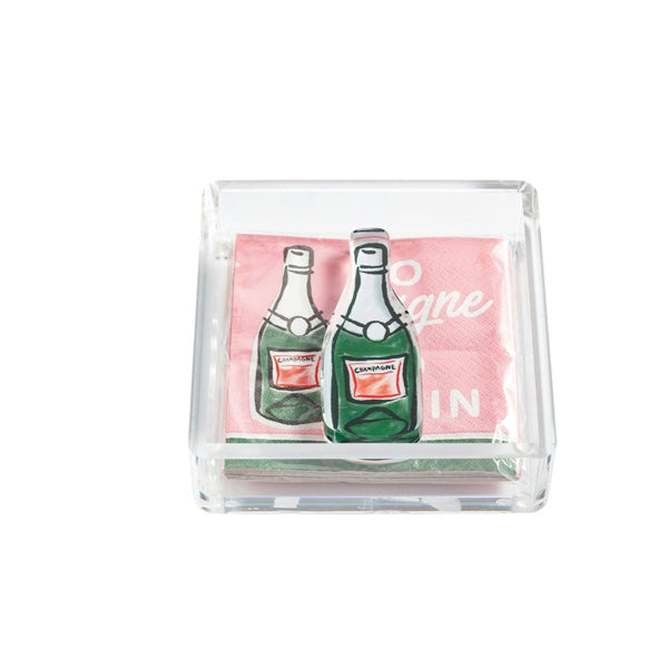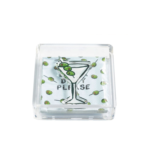 Pack of 12 paper cocktail napkins comes in acrylic display caddy with acrylic weight.