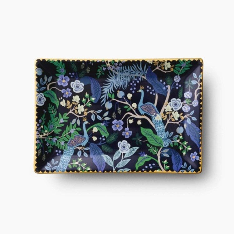 This elegant catchall tray is the perfect addition to any home decor, providing a stylish and practical solution for keeping track of your trinkets. The Peacock print in deep blue adds a touch of sophistication, while the metallic gold scalloped rim and accents bring a luxurious feel to the piece. Measuring 6.5" in length and 4.5" in width, this porcelain dish is ideal for holding keys, jewelry, or any other small items you want to keep organized. Hand wash only to preserve the beautiful design. Imported for quality craftsmanship, this catchall tray is a must-have for any stylish home.