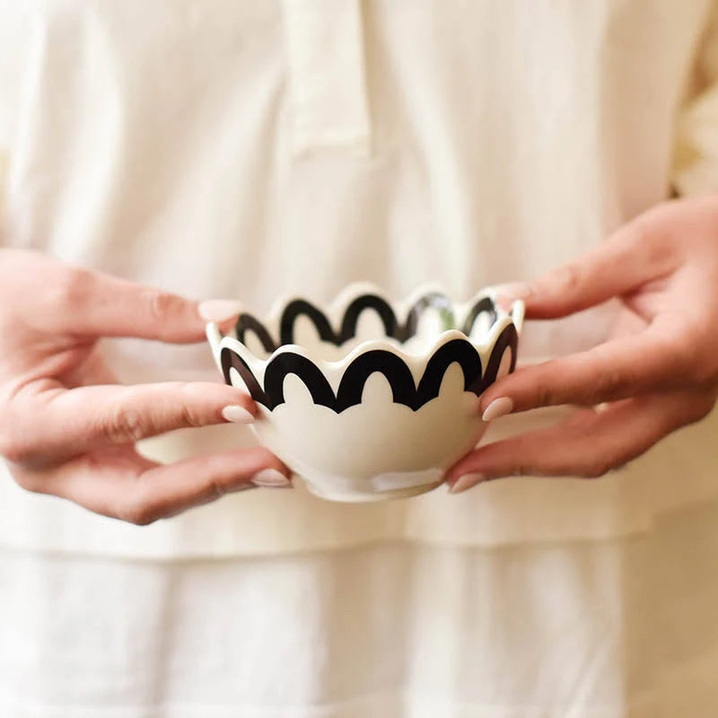 This extra small white dipping bowl features a striking Arabesque-inspired black pattern around the scalloped edge. Whether you're enjoying bread and olive oil before dinner or using it as a quick catch-all dish, you'll find countless uses for the must-have small bowl