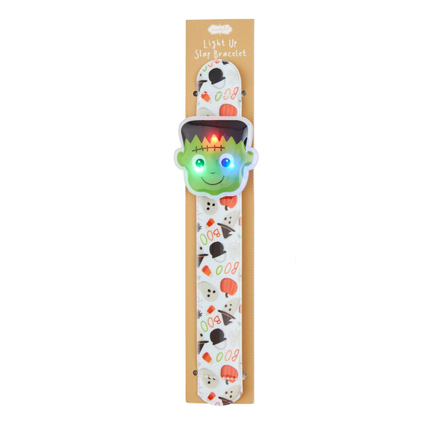 Patterned slap bracelet with LED light-up character. Comes on display card in cotton rope display basket. Battery included. Ages 3+.