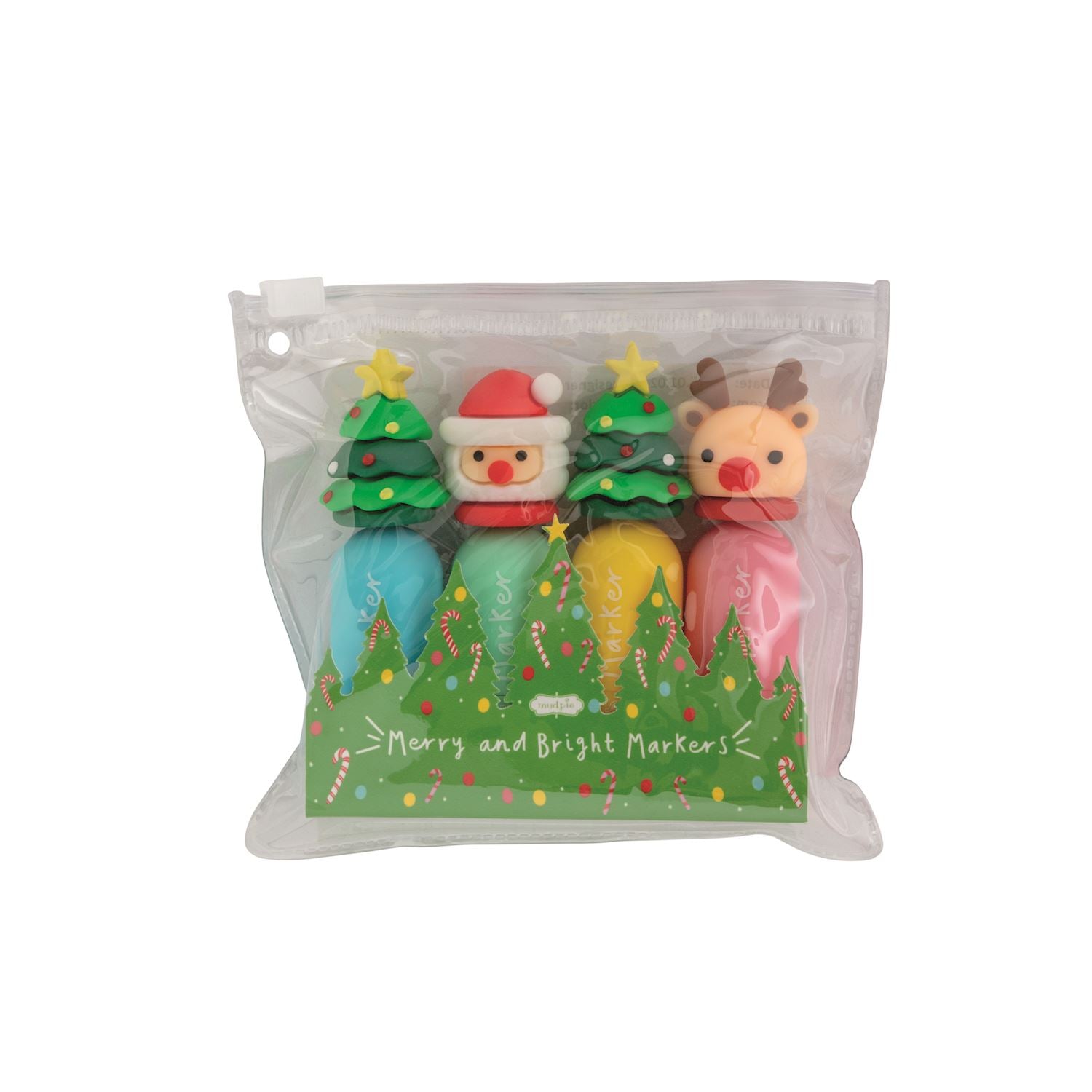 Set of four markers with Christmas character tops. Markers come in vinyl zipper pouch. Ages 3+.