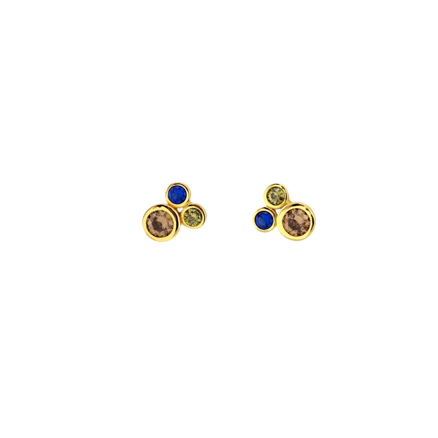 Modernist design cluster of bezel set cubic zirconia crystals. Studs measure 11mm length. Packaged in the signature glass bottle.