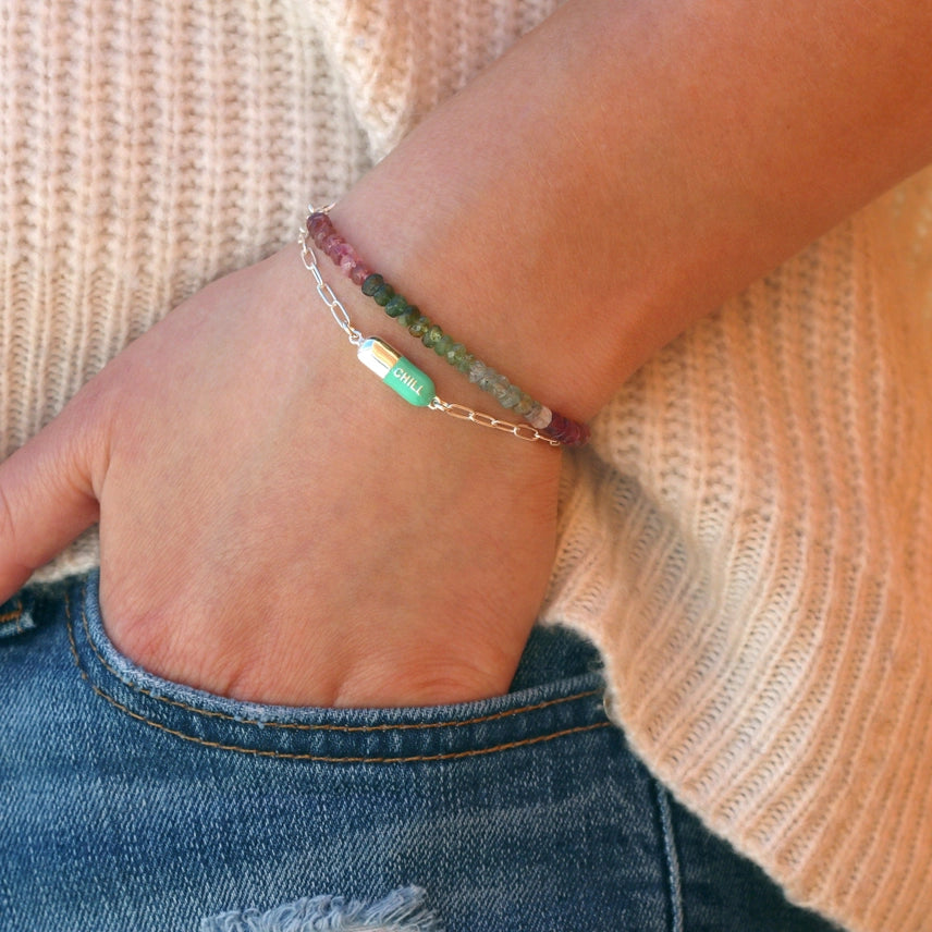 Watermelon tourmaline promotes happiness, love and rejuvenation. It enhances daily positive energy and inspires adventure. This Watermelon Tourmaline Bead Bracelet is handmade to order in our Half Moon Bay, CA studio. Faceted cut beads measure approximately 4-5 mm.